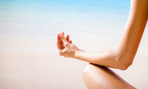 Young woman doing yoga moves or meditating on tropical ocean beach